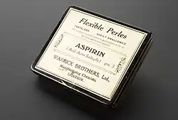 1853 behandelte der Chemiker Charles Frédéric Gerhardt Acetylchlorid zum ersten Mal mit Natriumsalicylat, um Acetylsalicylsäure herzustellen.[2] In der zweiten Hälfte des 19. Jahrhunderts stellten andere akademische Chemiker die chemische Struktur der Verbindung fest und entwickelten effizientere Synthesemethoden. 1897 begannen Wissenschaftler der Arzneimittel- und Farbenfabriken Bayer, Acetylsalicylsäure als weniger magenreizenden Ersatz für gängige Salicylat-Standardarzneimittel zu untersuchen und stellten einen neuen Syntheseweg ohne Verunreinigungen her.[2] Bis 1899 hatte Bayer dies Aspirin genannt und verkaufte es weltweit.[5] Das Wort Aspirin war der Markenname von Bayer und nicht der generische Name des Arzneimittels. Die Markenrechte von Bayer gingen jedoch in vielen Ländern verloren oder wurden verkauft. Die Popularität der Acetylsalicylsäure wuchs in der ersten Hälfte des 20. Jahrhunderts und führte zu einem heftigen Wettbewerb mit der Verbreitung von ASS-Produkten und ASS-Marken.[1]