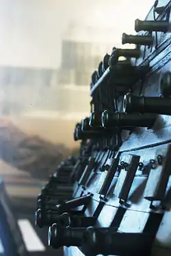 Frankreichs Chefminister, der Kardinal Richelieu (1624–1642) erkannte, dass zum Schutz der neuen Kolonien und Handelswege eine starke Kriegsflotte notwendig sei.[13] Noch 1627 hatte eine englische Flotte den Franzosen die Belagerung von La Rochelle (1627–1628) erschwert, 1628 kappten englische Piraten die Verbindungswege zwischen Frankreich und Québec. Zur Verbesserung der Effektivität der französischen Flotte wandelte Richelieu die bisherige Admiralität in ein Oberstes Marineamt um (1626) und legte ein großes Schiffsbauprogramm auf.[14] Die bisher selbständigen und oft nur saisonal aufgestellten Flotten der verschiedenen Küstenstädte, die in den verschiedensten Ländern (Niederlande, Italien, Frankreich) gebauten Schiffe und ihre aus unterschiedlichen Nationen (Franzosen, Italiener, Niederländer) bestehenden Mannschaften wurden zur permanenten königlichen Marine zusammengefasst und daraus zwei Flotten gebildet – die westliche Flotte du Ponant und die östliche Flotte du Levant. Erstere war in Brest zentriert und sollte den Atlantik sichern, letztere war in Toulon basiert und sollte das Mittelmeer sichern.