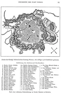 Im Schonischen Krieg wurde Wismar am 13. Dezember 1675 von dänischen Truppen angegriffen und bis November 1680 von den Dänen besetzt. Am 23. November 1680 zog der schwedische Graf Otto Wilhelm von Königsmarck als Vertreter des schwedischen Königs in die Stadt ein und Wismar wurde wieder ein Teil Schwedens. Anschließend bauten die Schweden Wismar zu einer der stärksten Seefestungen[21] Europas aus. So wurde die Hafeneinfahrt über die Festungsanlage auf der Insel Walfisch gesichert.