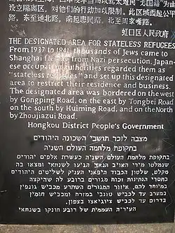 Auf Grund des zunehmenden Drucks durch die Nazis, wonach Japan endlich gegen die Juden in Richtung „Endlösung“ vorzugehen habe, wurde am 15. November 1942 beschlossen, die meisten eingewanderten Juden seitens der Japaner im Sinne eines politischen Zugeständnisses und um die Juden „besser unter Kontrolle zu halten“[30] zwangsweise in eine etwa 2,5 Quadratkilometer große Designated Area for Stateless Refugees (engl.: ausgewiesener Bezirk für staatenlose Flüchtlinge) deportiert. Zugleich wurden die wohlhabenden Juden, sowohl Ashkenazim als auch Sephardim, durch das japanische Militär enteignet.[34] Zwar gab es keine Mauern und keinen Stacheldraht, aber es gab Identitätskarten mit gelben Streifen, Kennzeichen, eine spezielle Wache mit ihren Willkürmaßnahmen. Die Grenzen bildeten Tafeln mit dem Hinweis: „Stateless refugees are prohibited to pass here without permission“ (engl.: Staatenlosen Flüchtlingen ist der Durchgang ohne Erlaubnis verboten). Als Wachen dienten die jüdische Hilfspolizei und Emigranten. Alle Emigranten erhielten neue Personalausweise. Die Sondergenehmigungen zum Verlassen des Bezirks trugen den Vermerk „Dürfen passieren“. Hier lebte auch eine chinesische Mehrheit, aber nur die staatenlosen Flüchtlinge waren verpflichtend an die Ausgangssperren und Zwangsübersiedlungen in Substandardwohnungen gebunden.