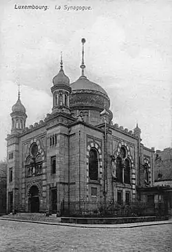 Der Synagogen-Neubau wurde von luxemburgischen und belgischen Juden sowie zum Teil auch vom luxemburgischen Staat finanziert. Zunächst erstellte der renommierte deutsche Architekt Ludwig Levy einen Entwurf. Die Ausführung erfolgte dann jedoch nach Plänen des luxemburgischen Staatsarchitekten Karl Arendt im neo-orientalischen Stil. Der Grundstein wurde im Juli 1893 gelegt, eingeweiht wurde das Gebäude am 28. September 1894. Zu dieser Zeit war Isaac Blumenstein der Rabbiner der luxemburgischen Synagogengemeinde, Präsident des Konsistoriums war Louis Godchaux, ein luxemburgischer Unternehmer.[3]