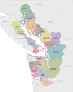 Einer der Stammesräte, die eine größere Gruppe von Salish vertreten, ist die 1993 gegründete Hul'qumi'num Treaty Group.[20] Sie repräsentiert die 6.200 Mitglieder der Chemainus First Nation, Cowichan Tribes, Halalt First Nation, Lake Cowichan First Nation, Lyackson First Nation und den Penelakut Tribe. Ihnen geht es um 59.000 ha Land, das in den 1860er Jahren an Siedler verkauft worden ist, um 268.000 ha, die 1884 zum Bau der Esquimalt and Nanaimo Railway auf Vancouver Island vergeben wurden. Kohleabbau, Waldwirtschaft und andere Industrien haben von der ursprünglichen Landschaft wenig übriggelassen. So gibt es nur noch auf 0,5 % des Stammesgebiets Urwald. Die meisten Reservate sind kleiner als 40 ha. Im traditionellen Stammesgebiet sind nur noch 48.000 ha Crown Land, also 15 %. Davon sind 8.000 ha als Parks und Schutzgebiete gesichert. Über 84 % sind also in Privatbesitz, davon allein fast 200.000 ha in der Hand weniger Holzunternehmen.[21] Das aber fürchten die häufig armen Gemeinden am meisten, dass ihre Mitglieder im Falle einer Privatisierung nach und nach verkaufen.