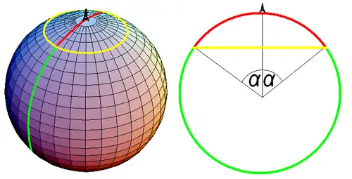 - Das Kugelparadoxon, auch Bertrand-Paradoxon genannt, wurde 1889 in einem Lehrbuch[5] von Joseph Bertrand aufgestellt. Es lautet: wird ein Punkt zufällig gleichverteilt auf der Oberfläche einer Kugel (etwa der Einschlagpunkt eines Meteoriten auf der Erde) ausgewählt, wie groß ist dann die Wahrscheinlichkeit, dass dieser Punkt von einem vorher fest gewählten Punkt (etwa dem im selben Jahr fertiggestellten Eiffelturm) einen Abstand von weniger als 10 Winkelminuten hat, dass also der Eiffelturm und der Zufallspunkt mit dem Erdmittelpunkt einen Winkel von weniger als Grad einschließt? Eine Möglichkeit, diese Wahrscheinlichkeit zu berechnen, besteht darin, die Fläche der in Frage kommenden Punkte (also die Oberfläche der Kappe um den Eiffelturm mit Radius 10 Winkelminuten) durch die Gesamtoberfläche der Kugel zu teilen, was etwa ergibt. Bertrand schlug aber noch eine zweite Lösung vor: da es für den Abstand irrelevant ist, auf welchem Großkreis durch den Eiffelturm der Punkt liegt und alle Großkreise gleich wahrscheinlich sind, genügt es, exemplarisch einen solchen Großkreis zu betrachten. Dann beträgt die Wahrscheinlichkeit einfach , da von 360 Grad genau 20 Bogenminuten oder Grad in Frage kommen. Bertrands Ansicht nach war keine der beiden Antworten falsch, sondern lediglich die Gleichverteilung auf der Mannigfaltigkeit der Kugeloberfläche nicht wohldefiniert.