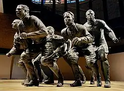 Zur gleichen Zeit war der Football allerdings auch schon in der ersten Krise, denn pro Jahr kamen mehr als ein Dutzend Spieler um, weil sie in Keil-Formationen (Flying Wedge – dt. „fliegender Keil“)[3] miteinander verhakt aufeinander einstürmten. Beim Flying Wedge rücken möglichst viele Spieler der Offensive Line sofort nach dem Snap aneinander und blocken nach vorne. Der Halfback und der Fullback schieben von hinten. Der Quarterback ist in der Mitte des Keils von allen Seiten geschützt, hält den Ball und in dieser Formation versucht man, Raum zu gewinnen. Die Defense hält ebenfalls mit viel Krafteinsatz dagegen. Diese Formation wurde 1894 verboten.[4] Trotzdem kamen im Jahr 1905 noch 18 Spieler ums Leben.[5] US-Präsident Theodore Roosevelt erzwang daraufhin Regeländerungen, die das Spiel sicherer machen sollten. Um das Jahr 1912 hatte Football dann die heutige Form angenommen. Insbesondere die Einführung des Vorwärtspasses markierte die Trennung vom Rugby endgültig. Ein Touchdown zählte fortan sechs Punkte. Die Spielfelddimensionen wurden an das neugebaute Stadion von Harvard angepasst.