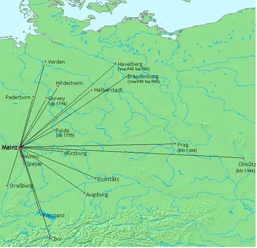 Dieser so begründete Mainzer Primat bedeutete jedoch nie mehr als die gewohnheitsrechtliche Präzedenz, also den Ehrenvorrang vor den anderen Bischöfen. Zur Ausbildung eines Primats im rechtlichen Sinne, als einer hierarchisch gefassten Instanz zwischen Papst und Metropoliten, ist es im Abendland nie gekommen[37]. Dazu kam noch, dass auch der Trierer Erzbischof die Rechte eines Primas beanspruchte und seit 968 auch der Erzbischof von Magdeburg.