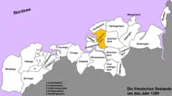 Der westliche Teil, der vor den Toren Nordens begann und in die Gegend von Aurich reichte, war bis zum Beginn des 13. Jahrhunderts weitgehend siedlungsleer. Bodenfunde Funde mittelalterlicher Kugeltopfware in Marienhafe sowie Funde aus muschelgrusgemagerter Ware im benachbarten Osteel deuten auf eine spärliche Besiedlung in der Zeit um 800 hin.[3]