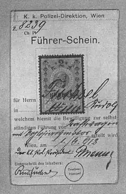 Die erste Führerscheinprüfung wurde in Wien am 14. August 1906 abgelegt. Sie galt nur für das Fahrzeug, mit dem man zur Prüfung antrat.