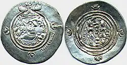 In den ersten fünfzig Jahren der Islamischen Expansion verwendeten die islamischen Eroberer zunächst die vorhandenen Münzen der Kaiser Herakleios und seines Nachfolgers Konstans II. weiter. Münzen dieser beiden Kaiser wurden in fast allen syrischen Fundstätten aus dieser Zeit archäologisch nachgewiesen und müssen in Byzanz geprägt worden und nach Syrien exportiert worden sein.[40] Im spätantiken iranischen Sassanidenreich war dabei eine weitgehend monometallische Silberwährung verwendet worden, die Oströmer prägten Gold-, Bronze- und Kupfermünzen. In den früheren sassanidischen Provinzen wurden nach der arabischen Eroberung weiterhin silberne Drachmen und goldene Dinare mit den Porträts von Chosrau II. oder Yazdegerd III. auf dem Avers und einem Feuertempel auf dem Revers verwendet. Geändert wurde nur das Datum, hinzugesetzt wurde eine kurze fromme Legende, oft die Basmala, und der Name des Herrschers. Vereinzelt finden sich auch islamische Symbole oder Porträts muslimischer Herrscher.