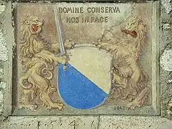 Darstellung des Wappens des Kantons Zürich in Schloss Laufen von 1942 mit dem Wahlspruch DOMINE CONSERVA NOS IN PACE (lat. «Herr erhalte uns in Frieden»)