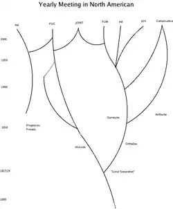 - Die Zeit der Aufspaltungen (ab Mitte 19. Jahrhundert bis heute) ist die der Schismen, Aufspaltungen und Wiedervereinigungen, hervorgerufen durch diverse evangelische, konservative und liberale Strömungen im Quäkertum.