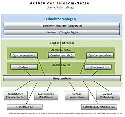 Zu einem Verbindungsbereich gehören sämtliche Übertragungskanäle, welche die Teilnehmeranlagen mit den Amtszentralen verbinden, aber auch die vielen notwendigen Sprech- und Datenkanäle, die zwischen den diversen Amtszentralen im Einsatz stehen. Darüber hinaus sorgt die Übertragungstechnik auch für den Anschluss an die Telefonnetze der Nachbarländer und heutzutage auch an die verschiedenen globalen Verbindungen.[10]