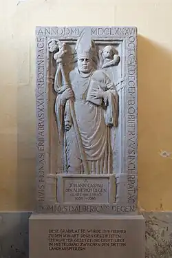 Der Casteller Archivar Jesko zu Dohna vermutet, dass die Ebracher Mönche als erstes den später als Silvaner bekannten Wein in Franken einführten. Von ihren Besitzungen aus verbreitete er sich über ganz Franken. Erhalten hat sich der Bildstockaufsatz im Bürgerspital in Würzburg, der ursprünglich in den Weinbergen am Stein oberhalb der Stadt aufgestellt war. Seine Inschrift von 1665 lautet: „Sanct Bernarde ora pro nobis. Ich habe gepflanzt, Apollo hat begossen, Gott aber hat das Wachstum gegeben. So ist weder der etwas, welcher pflanzt, noch der, welcher begießt, sondern Gott, welcher das Wachsthum gibt. 1. Cor. 3, 6-7. Zum Gedenken an Abt Alberich Degen, Prior von der Cistercienser-Abtei Ebrach, welcher die Oesterreiche-Rebe (Sylvaner) hier zuerst pflanzte, a. D. 1665“.[23]