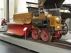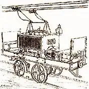 Werner Siemens baute 1879 in Berlin für eine ursprünglich als Grubenbahn für die Senftenberger Stadtgrube bei Cottbus vorgesehene Strecke mit 500 Millimeter Spurweite eine zweiachsige Elektrolokomotive. Sie wurde von einem ortsfesten Dynamo über eine mittig im Gleis angebrachte isolierte Stromschiene mit Strom versorgt, während die Fahrschienen als Rückleitung des Stromkreises dienten. Diese Lokomotive zog auf der Berliner Gewerbeausstellung 1879 auf einem 300 Meter langen Rundkurs drei Wagen mit darauf montierten Holzbänken für je sechs Fahrgäste.[5] Die Motorleistung der Lokomotive betrug 2,2 Kilowatt. Sie erreichte ohne Last eine Geschwindigkeit von 13 Kilometer pro Stunde und mit den jeweils mit sechs Personen besetzten Anhängern eine Geschwindigkeit von 6 km/h. Die Fahrtrichtung wurde durch ein Wendegetriebe geändert, da man die Drehrichtungsänderung des Motors durch Umpolen der Wicklung noch nicht kannte.[6]