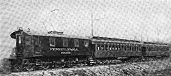 1883 erprobte Leo Daft seine zwei Tonnen schwere Experimentierlokomotive Ampère auf der schmalspurigen Saratoga, Mount McGregor and Lake George Railroad im US-Bundesstaat New York. Sie zog einen gewöhnlichen Eisenbahnwagen von zehn Tonnen Masse und 68 Fahrgästen zuzüglich fünf Personen auf der Lokomotive selbst mit etwa 13 km/h über eine Steigung von 1:57.[17] Die elektrische Energie kam dabei über eine Stromschiene zwischen den Fahrschienen.