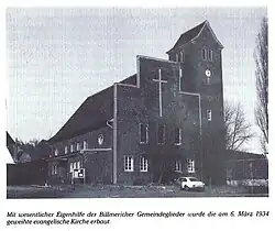 1933 wird ein Kirchbauverein in Billmerich gegründet. Es soll eine Kirche gebaut werden, die fast ausschließlich auf Spenden und Eigenleistung erstellt werden sollte. Eine 1873 gegossene Bronzeglocke konnte von der Kirchengemeinde Bausenhagen erworben werden. Am 6. März 1934 konnte die ev. Kirche (siehe Abbildung 14) in Billmerich eingeweiht werden. Die Gesamtkosten beliefen sich auf 16.000 Reichsmark. 1946 gründete der Konservatoriumsdirektor Metzger aus Berleburg einen Kirchenchor, Kinderchor und Instrumentalkreis.