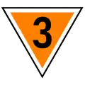 Ankündigungssignal Eine schwarze Kennziffer auf einer auf der Spitze stehenden dreieckigen rückstrahlenden gelben Tafel mit weißem Rand. Bei beschränkten Raumverhältnissen kann die Dreieckspitze nach oben zeigen.