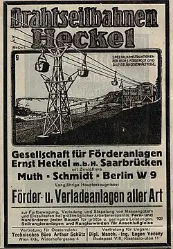Ernst Heckel hatte mit seinem Bruder Georg Julius (1856–1928) die väterliche Drahtseilfabrik fortgeführt und ihre Produkte erfolgreich in die maschinelle Streckenförderung der saarländischen und Lothringer Bergwerke eingeführt. In der neuen Firma erweiterte Ernst Heckel das Tätigkeitsfeld auf die verschiedensten Transport- und Förderanlagen. Die mit Unterstützung von Karl Glinz und anderen entwickelten Neukonstruktionen umfassten bald Transport-, Rangier- und Verladeanlagen aller Art. Das Unternehmen produzierte Materialseilbahnen, Standseilbahnen, Seil- und Kettenförderungen, Transportbandanlagen, große Speicher- und Verladeanlagen, Rangieranlagen usw. Es entwickelte und produzierte die erste Skipförderung. Für die Deutsche Reichsbahn wurden innovative Seilablaufanlagen in Dresden und Chemnitz errichtet.