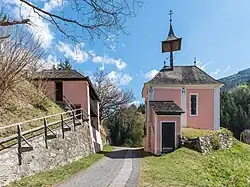 Östlich der Straße befindet sich der rechteckige Kapellenbau, eine spätbarocke, im Kern gotische Anlage mit gotischem Kreuzrippengewölbe, Walmdach und Glockenturm. Der Altarraum befindet sich etwa zwei Meter über Straßenniveau, ist straßenseitig durch einen großen Rundbogen geöffnet und durch ein schmiedeeisernes Gitter gegen die Straße abgesichert. Seitlich führt ein Aufgang in die Kapelle. Eine ursprünglich 1861 von Josef Messner an die Kapellwand gemalte Szene der Kreuzabnahme wurde 1925 übermalt und 1944 renoviert. Weitere Wandmalereien in der Vorhalle stammen aus dem Jahr 1754, sie wurden 1991/92 erneuert.