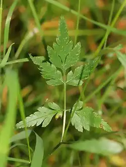 Die am Grund sowie der unteren Hälfte des Stängels stehenden Laubblätter bestehen aus einem 2 bis 7 Zentimeter langen Blattstiel und einer ein- bis zweifach gefiederten Blattspreite. Die dunkelgrüne Blattspreite ist im Umriss dreieckig-eiförmig bis eiförmig-lanzettlich und bis zu 20 Zentimeter lang und 17 Zentimeter breit. Die Blattfiedern sind breit eiförmig-lanzettlich mit einer Länge von 2 bis 6 Zentimeter und einer Breite von 1 bis 2,5 Zentimeter, die Endfieder ist verlängert. Die obersten Stängelblätter sind weniger gegliedert und oft nur dreispaltig.[1] Die Laubblattscheiden sind schmal und etwas hautrandig.[1]