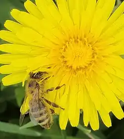 Durch das frühe Erscheinen seiner Blüten ist der Löwenzahn eine wichtige Bienenweide, die der Entwicklung der Bienenvölker im Frühjahr dient, bei größeren Vorkommen aber auch eine Frühtracht-Honigernte ermöglichen kann. Löwenzahnhonig hat ein kräftiges Aroma, ist im frischen Zustand goldgelb und dickflüssig und kristallisiert feinkörnig zu einem dann gelblichen Honig aus.[11] Für ein Kilogramm Honig muss ein Bienenvolk über 100.000 Löwenzahnblüten besuchen.