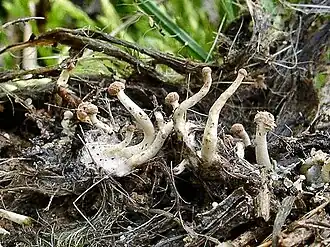 Der Fruchtkörper ist gestielt-kopfig und wirkt wie ein winziger Pistill. Die Köpfchen sind ca. 1 bis 2 Millimeter breit und beigebräunlich gefärbt. An der Außenseite sind sie kleiig. Der Stielteil hat eine Länge von ungefähr 5 bis 6 Millimeter und ist weißlich. In den Köpfchen werden die Sporen gebildet. Je 8 Sporen befinden sich in kugeligen bis eiförmigen Asci. Die Peridie des kopfigen Teils fällt bei der Reife auseinander, wodurch die Asci freikommen. Später degenerieren sie und geben die Sporen frei. Das Sporenpulver ist blass bräunlich. Die Sporen messen 5,5 bis 6,5 × 2,5 bis 3 Mikrometer. Sie sind mehr oder weniger hyalin, elliptisch, glatt und weisen 2 Öltröpfchen auf.
