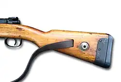 - seitliche Riemenbefestigung mit Schaftdurchbruch und Lochplatte als Hilfsmittel zur Zerlegung des Schlosses (nach Muster des Karabiner 98k)