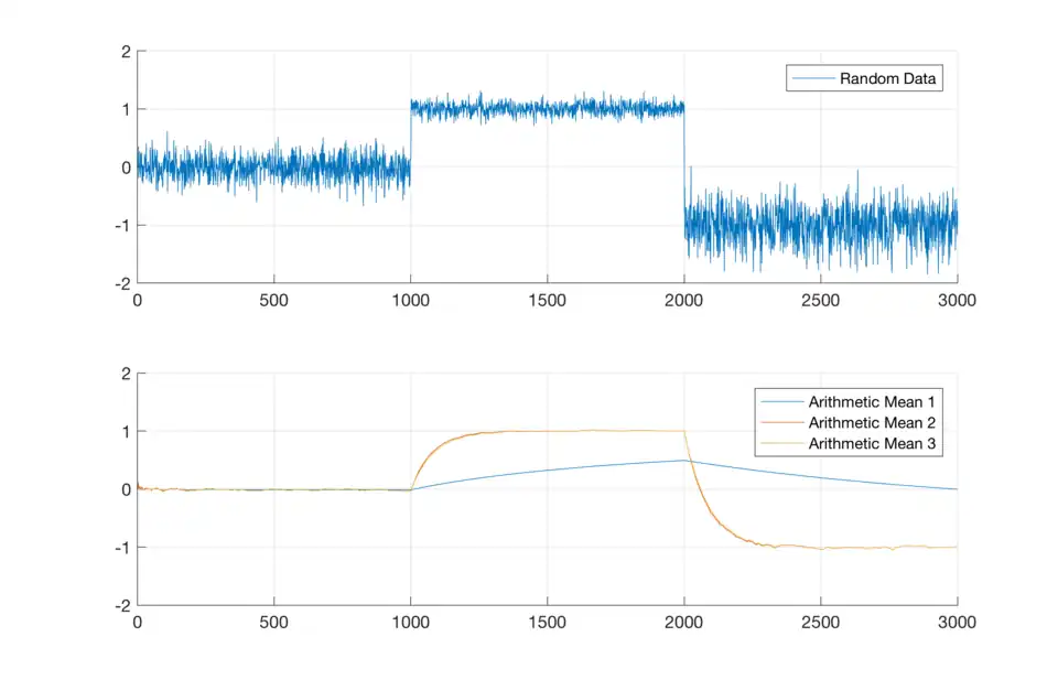 Nebenstehend ist exemplarisch das Verhalten der hier angegebenen Rekursions-Gleichungen, bei einem einfachen instationären, stochastischen Prozess (bereichsweise normalverteilt) zu sehen. Im Verlaufe der Zeit weisen der Erwartungswert sowie die Varianz der Zufalls-Daten ein sprunghaftes Verhalten auf. Die einfache Rekursionsgleichung ohne Vergessensfaktor (Arithmetic Mean 1) reagiert nur sehr träge auf das Verhalten des Datensatzes. Wohingegen die Rekursionsgleichungen mit Vergessensfaktor (Arithmetic Mean 2 & 3, ) deutlich schneller reagieren. Es fällt weiterhin auf, dass die Algorithmen mit Vergessensfaktor zu einem etwas größeren Rauschen führen. In diesem Beispiel sollte jedoch klar sein, dass die schnellere Reaktionszeit Vorrang hat. Die Ergebnisse „Arithmetic Mean 2“ und „Arithmetic Mean 3“ unterscheiden sich hier nur sehr gering voneinander. Je nach Datensatz, vor allem je nach Menge an Daten, kann dies deutlich anders aussehen.