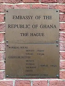 Die Ghanaische Botschaft Den Haag (englisch Embassy of Ghana The Hague) ist die diplomatische Vertretung Ghanas in den Niederlanden. Das Botschaftsgebäude befindet sich im Den Haager Zentrum. Ghanaischer Botschafter in den Niederlanden ist seit Juli 2021 Francis Danti Kotia.