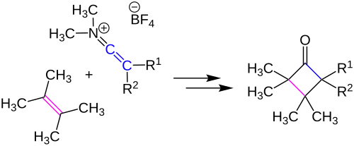Wenn es sich bei den Resten R1 und R2 des Enamins um Methylgruppen handelt, wird die Verbindung auch als Ghosez's Reagenz bezeichnet.[3] Aus dem Keteniminium-Ion und einem Alken entsteht durch [2+2]-Cycloaddition ein Cyclobutanon-Derivat: