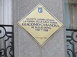 Gedenktafel an das wohl nicht mehr bestehende Geburtshaus Casanovas in der heutigen Calle Malipiero „già Calle della Commedia“.[15]
