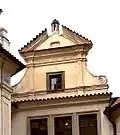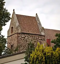 • Ein Glockengiebel ist ein Giebelaufbau mit einer oder mehreren Öffnungen, in denen Glocken hängen. Der Glockengiebel ist oft selbst mit einem Dreiecksgiebel abgeschlossen. Er findet sich bei kleinen Kirchen oder Kapellen vor allem im Mittelmeerraum.[20] Sonderformen sind die stets dreigeteilten Clochers trinitaires genannten Giebel an den Kirchen im baskischen Pays de Soule und die beinahe burgartig wirkenden rechteckigen Glockengiebel (franz. clochers mur) im Raum von Toulouse.