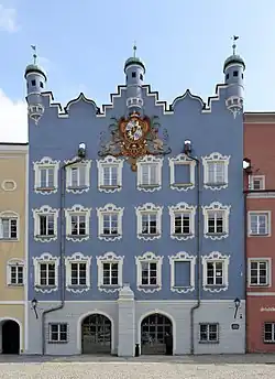 Scheingiebel, auch Blendgiebel Die Giebelform nimmt keinen Bezug auf die Dachform oder Neigung.[16] Dies ist besonders ausgeprägt im Inn-Salzach-Stil.