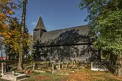 - Im 15. Jahrhundert wurde eine Schrotholzkirche errichtet, die zunächst als die Grabkapelle des Adelsgeschlechts Gierałtowski diente. Während der Reformation wurde das Gotteshaus von evangelischen Gläubigen genutzt. 1617 wurde die ursprüngliche Kapelle zu einer Kirche erweitert. Weitere Umbauten an der Kirche erfolgten in den Jahren 1694, 1822–1823 und 1889. Die Saalkirche mit einem mehrseitig geschlossenen Chor, Schindeldach, quadratischem Westturm und Deckenmalereien in der Sakristei steht seit 1953 unter Denkmalschutz.[5] befinden sich Deckenmalereien aus der Spätrenaissance. Der Kanzelaltar wurde 1822 im Rokokostil errichtet.