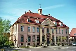 Der zweigeschossige barocke Putzbau mit reichem Stuckdekor, Mansardwalmdach, Dachreiter und Mittelrisalit hat eine Pilastergliederung sowie einen Dreiecksgiebel mit Uhr.
