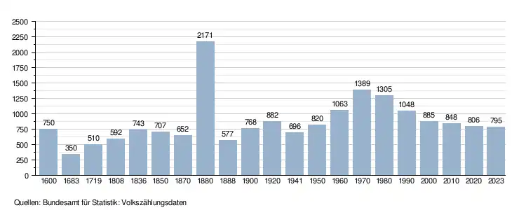 - ↑ Daten der Eidgenössischen Volkszählungen ab 1850 nach Gemeinden. (XLSX; 10 MB) Bundesamt für Statistik, Neuchâtel, 12. Juli 2024, abgerufen am 7. April 2025 (Öffnung in Excel nur über "Anhang/Excel-Datensatz" möglich).