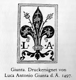 1477 zog Lucantonio Giunti mit seinem Bruder Bernardo nach Venedig, wo er eine Buchhandlung eröffnete, die 1489 zu einem Verlag wurde. 1499 gründete er eine Druckerei,[2] die 1537 nach dem Tod des Gründers unter der Firma Haeredes L. A. de Giunti an seinen Sohn Tommaso Giunti überging, brannte 1557 ab, wurde aber wieder aufgebaut und lieferte 1657 ihren letzten Druck.