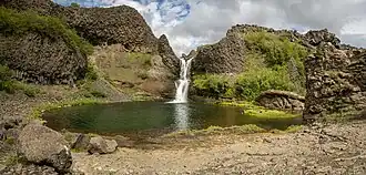 Aus dem Nordosten kommend stürzt die Rauða auf einer Breite von 3 m um 16 m[1] in die Tiefe.