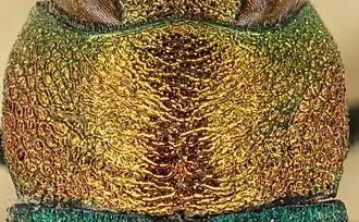 Der Halsschild ist fast rechteckig und breiter als lang. Die breiteste Stelle liegt hinter der Mitte. Er ist netzartig oder wabenartig erhaben gemustert. In einem breiten mittleren Streifen sind dabei die zur Basis parallel laufenden Erhabenheiten stärker ausbildet als die in andern Richtungen verlaufenden Netzlinien, sodass in diesem Bereich der Halsschild quer gerunzelt oder gerippt erscheint (Bild). Der Vorderrand des Halsschildes ist in der Mitte nach vorn ausgebuchtet, rechts und links davon nach hinten eingebuchtet (deutlich doppelt gebuchtet, Bild 1). Der Hinterrand des Halsschildes ist fast gerade. In den Seitenecken der Basis ist er nicht ausgehöhlt. Das Schildchen ist klein und dreieckig.