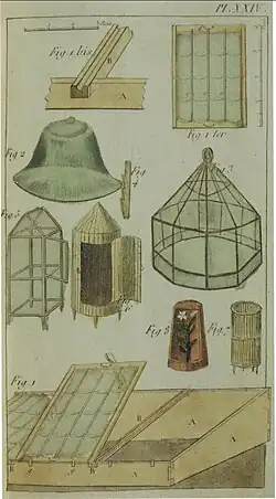 Olivier de Serres beschreibt um 1600 den Einsatz von Glasglocken, in der Form großer Hüte, welche unten die Form einer Glocke haben, als Bedeckungen in der Melonenkultur. Andere sähen aus wie der Helm von Destillierkolben ohne jeden Rand. Der Durchmesser der Glocken, mit denen die gesäten Samen abgedeckt wurden, betrage einen Fuß. Zum weiteren Erwärmen des Bodens empfahl er der Erde im Beet frischen Pferdemist beizumischen.[1]