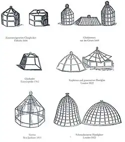 Peter Lauremberg beschrieb 1631 Glasglocken mit einer Öffnung am oberen Ende. Mit der Glocke, die tagsüber über die Kulturen gestülpt wurde, sollte die Keimung und das Wachstum von frühen Früchten beschleunigt werden. Die Öffnung, die bei Bedarf geschlossen werden konnte, diente dazu, Ausdünstungen und zu warme Luft entweichen zu lassen. In Frankreich wurde diese Ausführung als „Englische Glocke“ bezeichnet. Verbreiteter waren aber die geschlossenen Versionen, die auch nachts vor Kälte schützten. Erwähnt sind sie unter anderem in einer Aufstellung für eine Lieferung an Schloss Gottorf aus dem Jahr 1633, von John Evelyn 1660 (mit Bild), von Johann Sigismund Elsholtz (1666) und von Wolf Albrecht Stromer von Reichenbach 1671. Die erstmals von John Evelyn beschriebene Ausführung mit einem Knauf zum Anfassen war später am verbreitetsten und wurde auch von Georg Andreas Böckler 1678, Franz Philipp Florinus 1702 sowie in der „Encyclopédie, ou ou Dictionnaire raisonné des sciences, des arts et des metiers“ 1762 beschrieben. Die meisten Glocken hatten einen Durchmesser von 15 bis 20 Zentimeter. Gefertigt wurden aber auch größere Ausführungen mit bis zu 60 Zentimeter Durchmesser und kleine in der Größe einer Kaffeetasse. Der Farbton des Glases war unterschiedlich; neben Glocken aus klarem Glas wurden auch Exemplare in verschiedenen Grün-, Blau- und Rottönen angeboten. Dabei waren Glocken aus dunklem Flaschenglas am weitesten verbreitet, weil sie zum geringsten Preis angeboten wurden. Sie ließen mehr Wärme und weniger Licht ins Innere, weswegen sie auch zum Bleichen von Blumenkohl verwendet wurden. Farblose Glasglocken aus klarem Glas waren am teuersten.[1]