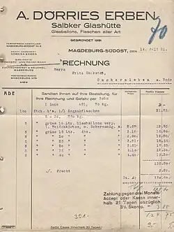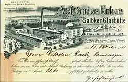 Der Name Dörries geht auf August Dörries zurück. Der am 16. Oktober 1828 in Mühlenberg im Solling geborene Dörries kam 1878 von Nienburg/Weser nach Westerhüsen und leitete die Glasproduktion der etwas südlich gelegenen Westerhüser Glasfabrik. Im Jahr 1891 übernahm er dann die Salbker Glashütte und verstarb bald darauf am 22. Februar 1892.[1] Das Unternehmen wurde unter der Firma A. Dörries Erben, Salbker Glashütte an der Adresse Alt Salbke 51-53 von Heinrich Dörries und Rudolf Glahn weitergeführt. Ende der 1920er Jahre war die Firma nicht mehr verzeichnet.