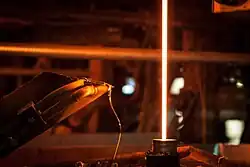Glaswolle­herstellung im Blasverfahren: Flüssiges Glas läuft in eine Zerfaserungs­maschine (2012)
