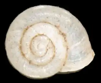 Das dick scheibenförmige Gehäuse ist 1 bis 1,5 mm hoch und 2 bis 2,75 mm (2 bis 2,5 mm[1]) breit. Es hat 2 3/4 bis 3 3/8 gut gewölbte, aber nicht geschulterte Umgänge, die regelmäßig zunehmen. Das Gewinde hebt sich nur wenig aus der Gehäuseebene. Das Embryonalgehäuse nimmt etwa 1 1/8 Windung ein. Die Umgänge sind an der Peripherie mäßig gewölbt, und umgreifen sich im Querschnitt gesehen stark. Die letzte Windung kann zur Mündung hin leicht ansteigend oder auch leicht abfallend. Das Embryonalgehäuse zeigt eine feine Chagrinierung. Der Teleoconch weist dagegen nur unregelmäßige Anwachsstreifen auf. Der Nabel ist tief und schüsselförmig.