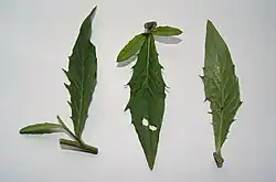 Es sind keine Grundblätter vorhanden.[1] Die meist 5 bis 20 (3 bis 50)[1] wechselständig am Stängel angeordneten Laubblätter sind sitzend oder kurz gestielt und nicht stängelumfassend. Die unteren Laubblätter sind geflügelt-gestielt, die mittleren sind kürzer gestielt oder wie die oberen sitzend.[2] Die rein-grünen, drüsenlosen Blattspreiten sind lanzettlich, länglich-lanzettlich bis elliptisch-lanzettlich, ei- bis linealisch-lanzettlich[1] und drei- bis achtmal so lang wie breit sind. Die Blattunterseite ist etwas heller als die Blattoberseite und weist eine mehr oder weniger undeutliche Nervatur auf. Die mittleren Stängelblätter besitzen einen keilförmigen, teilweise etwas gerundeten Spreitengrund. Während der Blütezeit sind meist keine Grundblätter vorhanden. Alle Laubblätter sind in den unteren zwei Dritteln gezähnelt bis grob und oft lang vorspringend gesägt-gezähnt und haben beiderseits drei bis fünf große Zähne und dazwischen meist kleine Zähne.[1][2]