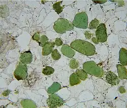 Unter dem Mikroskop erscheint Glaukonit im Gegensatz zu anderen Glimmern nicht in der Form von schichtförmig gepackten Kristallen oder Blättchen, sondern als rundliche Körner (Pellets), in denen die Kristalle keine bevorzugte Orientierung haben. Diese fallen sofort durch ihre kräftig gelb- bis blaugrüne Eigenfarbe auf, die bei beginnender Oxidation zu Limonit nach Braun umschlägt. Für manche dieser Pellets wird eine Herkunft aus den Exkrementen (Kotpillen) unbekannter mariner Organismen angenommen; sie sind aber auch als Füllungen der Kammern von Foraminiferen zu finden.[8]