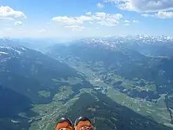 Grundsätzlich sind auch Flüge zu zweit unter einem Gleitschirm möglich. Der Pilot und sein Passagier sitzen jeweils in einem eigenen Gurtzeug voreinander und sind durch eine Tandemspreize mit dem Schirm verbunden. Es können mit Passagier alle Flugmanöver geflogen werden, selbst Akrobatikflug ist möglich. Durch die Sitzposition voreinander kann der Passagier bei Bedarf (in Deutschland und Österreich allerdings verboten) auch die Steuerleinen und die Steuerung des Flugs übernehmen.[59]