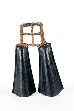 Zu den selteneren Formen mit beschränkter Verbreitung gehört die Rahmengriff-Doppelglocke aus zwei fast gleich großen Glocken, die über einem rechteckigen Rahmen miteinander verbunden sind. Bei Angermann (1901) findet sich eine Abbildung und die geographische Zuordnung nach Kamerun.[94] Der Eisenrahmen des tatsächlich nur aus Kamerun bekannten Typs ist mit Flechtwerk umwickelt, der untere Steg besteht ebenfalls aus geflochtenem Material. In der Mitte kann dieses eine Art Fensterkreuz bilden.[95]