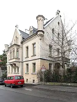 Das in Sandstein neugotisch gestaltete Gebäude steht in Hanglage am Glockenberg. Es ist ein zweigeschossiger, traufständiger Satteldachbau mit einem Tiefparterre auf einem L-förmigen Grundriss. Die Ecken des Hauptgebäudes tragen an der Dachkante angesetzte Polygonaltürmchen. Ein mittiger Zwerchhausrisalit, aus dem im zweiten Obergeschoss ein zweiachsiger Kastenerker auf drei Konsolen ragt, betont die Traufseite mit ihren sechs Fensterachsen. Die westliche Giebelfront prägt im zweiten Obergeschoss ein mittiger, polygonaler Kastenerker. Die östliche Giebelfront hat ein Portal, das von einer viersäuligen Balusteraltane überbaut ist, deren Achse sich nach oben hin in drei Maßwerkfenstern und einem Giebel mit kleinem Treppenaufsatz fortsetzt. Ein Blendbogenfries läuft unter den Dachtraufen entlang.[1]