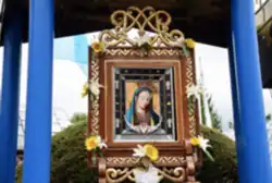 Ihren Kopf umgibt eine filigran geschnitzte Aureole und das Gesicht ist leicht nach links geneigt. Das Haupthaar wird von einem weißen Musselin-Schleier und einem weiteren blau-gelben Schleier bedeckt, die Brust ist dunkelrot. Das Bild ist stark geschmückt, jedoch nicht sehr groß, die Maße sind: 40 cm Höhe × 27 cm Breite.