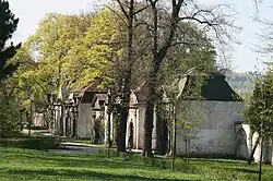 Das einheitliche Bild von Gnadenkirche, Grabmälern und den von Bäumen gesäumten Wegen wird von den Grufthäusern entlang der Umfriedungsmauer malerisch umrahmt.